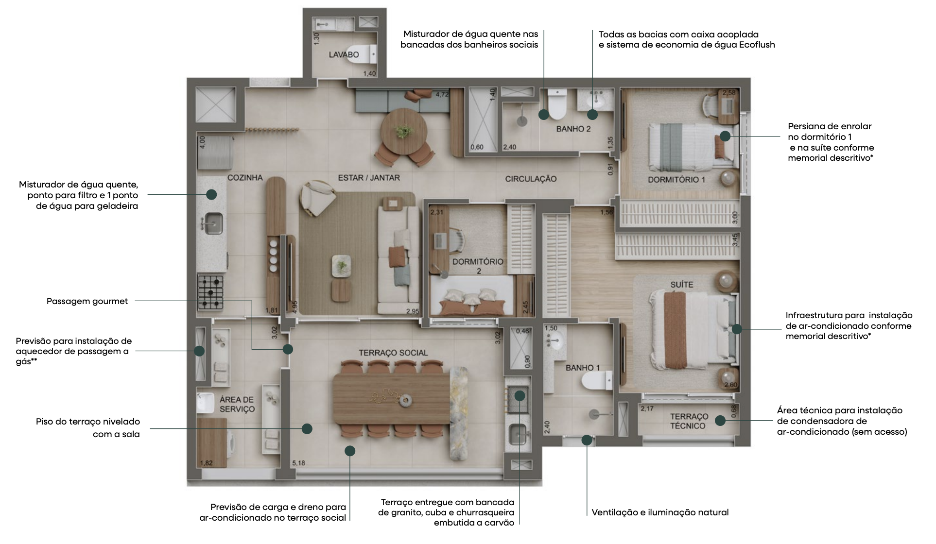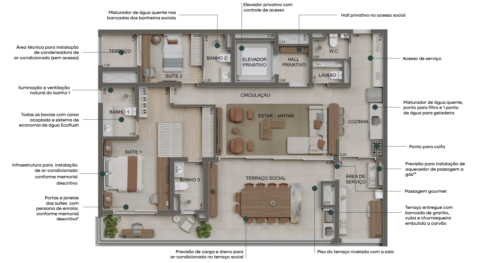 Apartamento Tipo B – 142 m² | 4 suítes | 3 vagas de garagem